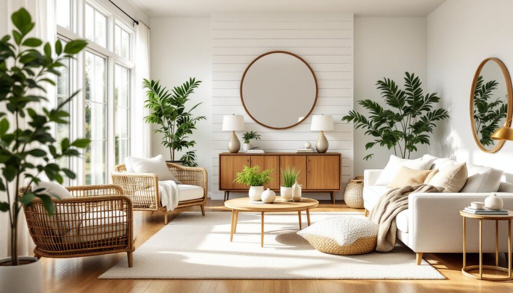 Start with a layered approach to furniture. Include pieces in warm wood tones (walnut, oak, or honey-stained finishes), cool metals (brushed steel, matte black, or brass), and natural materials like rattan, jute, and linen. A white room with white furniture and white textiles becomes one-dimensional fast. Break that up intentionally.
